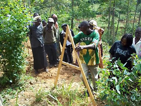 Ferdinand Wafula, who is the organization’s coordinating officer, describes how local farmers learned how to use the A-frame level to make contours before digging a swale (shallow trench) across a slope in order to conserve water: