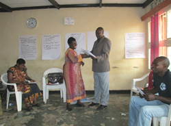 Lors de cette activité, les participants ont écrit sur trois grandes feuilles de papier qui étaient affichées et sur lesquelles figuraient les mots : Espoir, Crainte et Attentes. Sous le mot Espoir, ils ont écrit : le patrimoine, la force de travailler pour les familles, la paix et l’entente dans la famille, les enfants et l’unité. Sous le mot Crainte, ils ont écrit : SIDA, la mort, l’infidélité, le divorce, la violence, la pauvreté et la famine. Quant à leurs attentes, ils ont dit qu’ils aimeraient savoir comment maintenir la paix dans la famille, comment se soutenir mutuellement, parvenir à bien communiquer et comment promouvoir la coopération au sein du foyer.